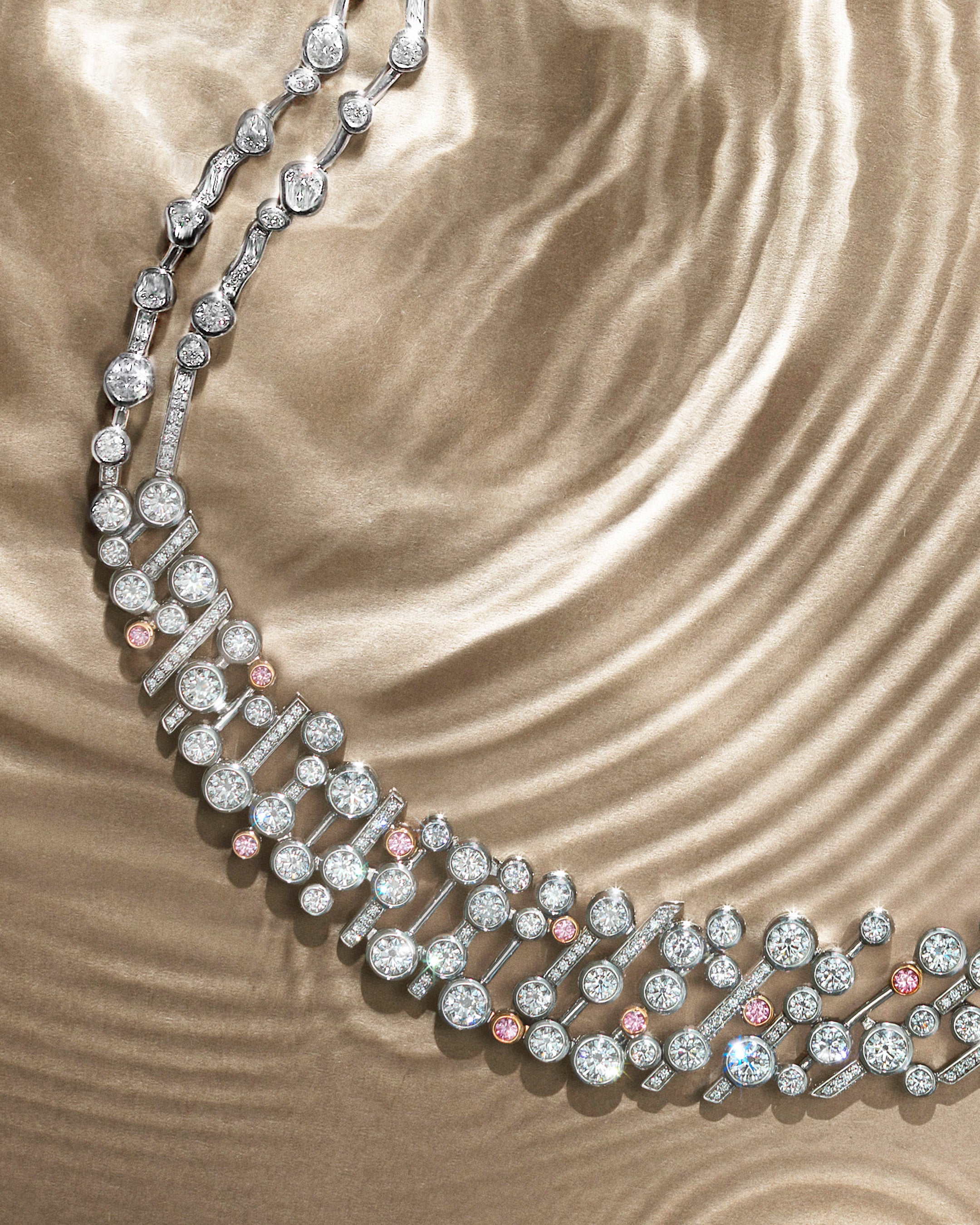 The creative vision for the garden draws heavily on the styles and motifs of the collection. Circular paving pads, featuring etched concentric circles, lead the visitor to a platinum-coloured Raindance pavilion, complete with a domed roof that channels rainwater to a circular rill at its base. Three circular platinum-finished water features, arranged in a diamond bezel configuration, complement the pavilion and are reminiscent of the collection.
