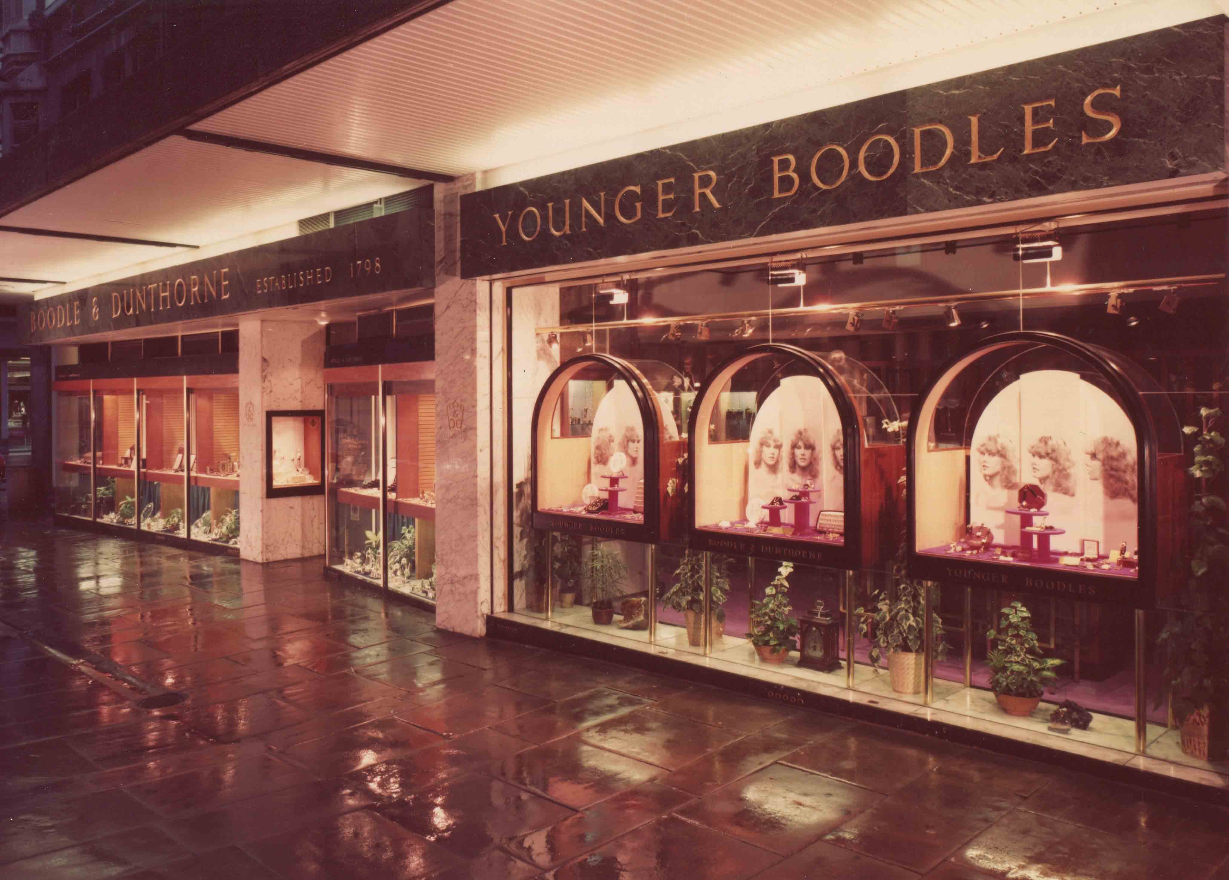 Such was the popularity of the showroom that by 1967 we were already expanding. Boodles acquired a prestigious corner site on Eastgate Street, extending into what would become the Grosvenor Hotel arcade. With fifteen windows dressed in marble and teak, the new frontage ranked among the finest jewellery salons in Europe – a stage fit to display both timeless classics and daring new designs sourced from Paris, Florence and beyond.
