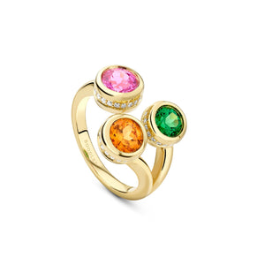 Beach Three Stone Sapphire Garnet Tsavorite Yellow Gold Ring
