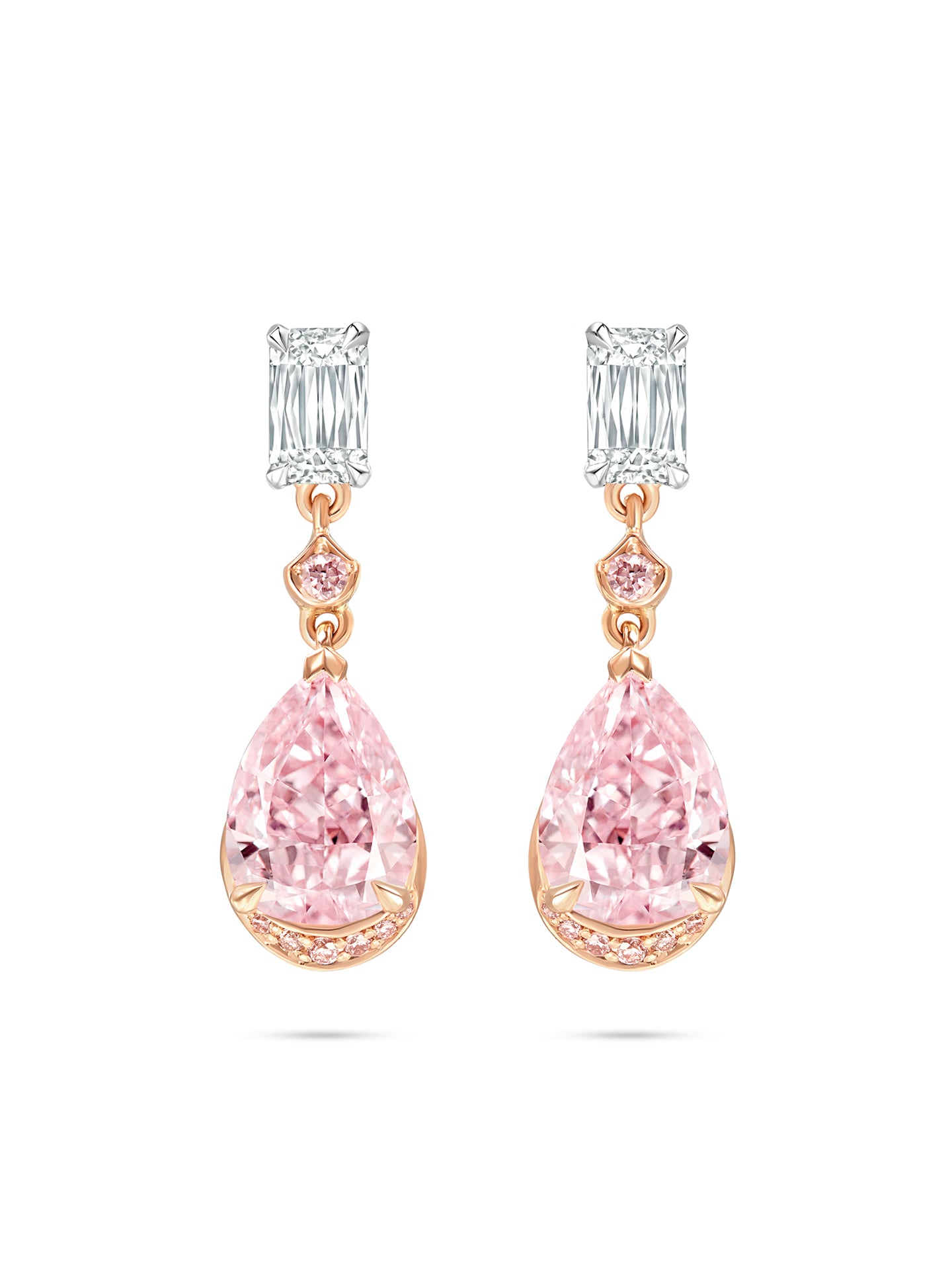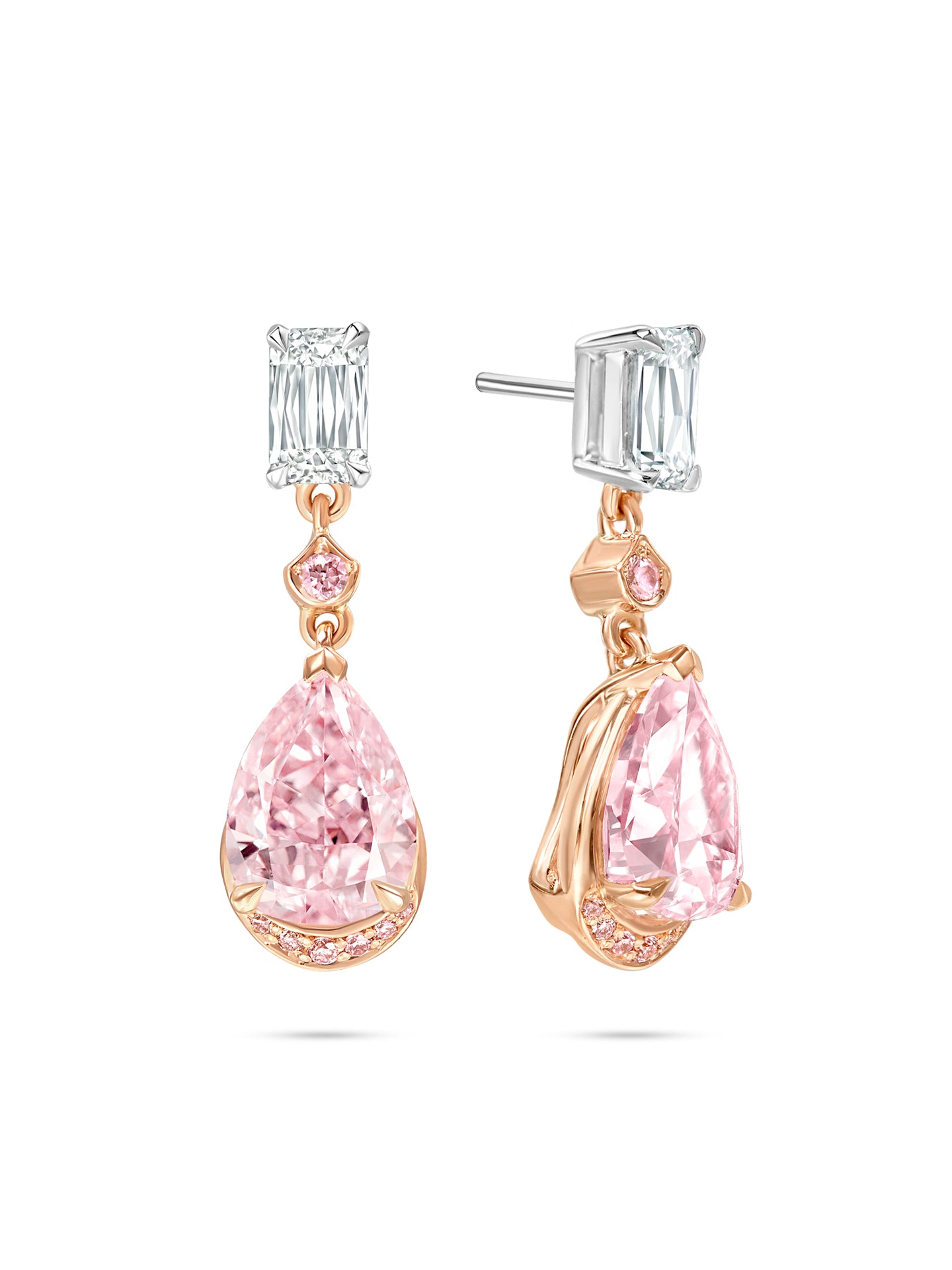 A pair of Ashoka and pink pear diamond drop earrings in platinum and 18 carat Single Mine Origin rose gold. The main pink pear diamonds are certificated Fancy Purplish Pink 1.02 carats and Fancy Pink 1.02 carats. The two Ashoka diamonds are certificated 0.24 carats FVVS1and 0.24 carats FVVS1. The total weight of the 14 additional brilliant cut pink diamonds is 0.08 carats. By Boodles.