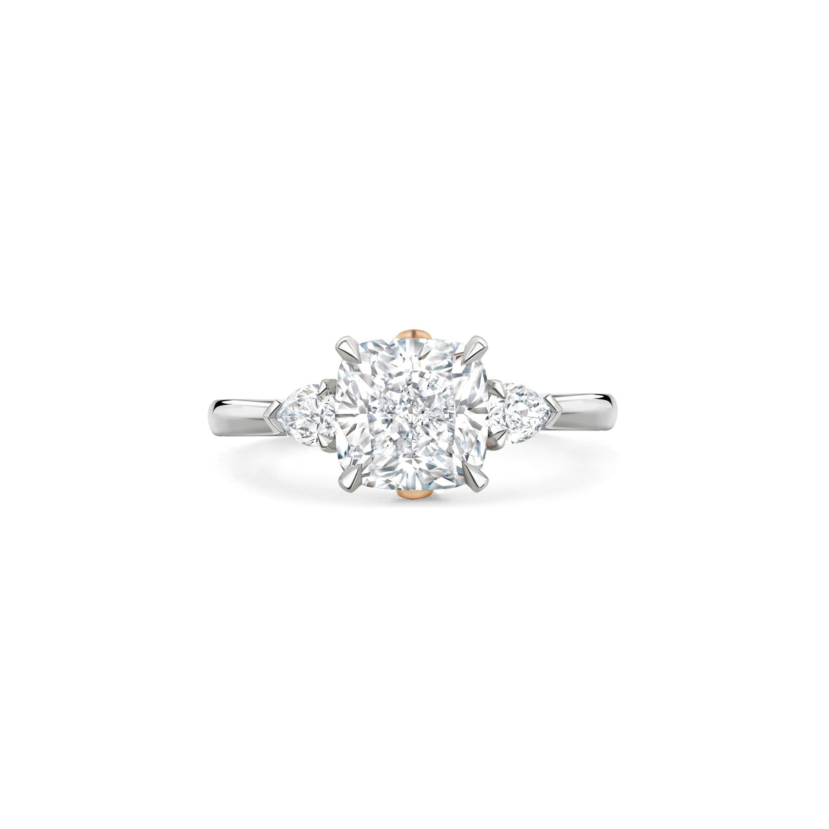 A Petal design ring set with a cushion shape diamond and pear cut diamond shoulders in platinum. The main cushion diamond is certificated 2.22 carats DVS1. The total weight of the 2 pear diamonds is 0.30 carats, and additional brilliant cut pink diamonds is 0.01 carats and white diamonds is 0.03 carats. By Boodles.