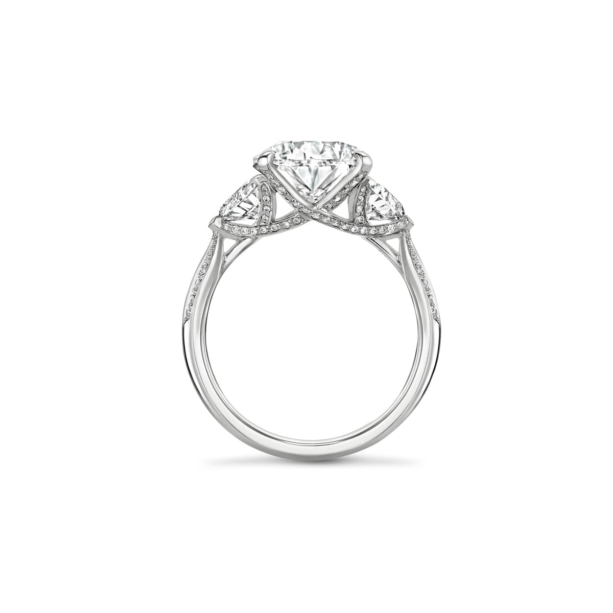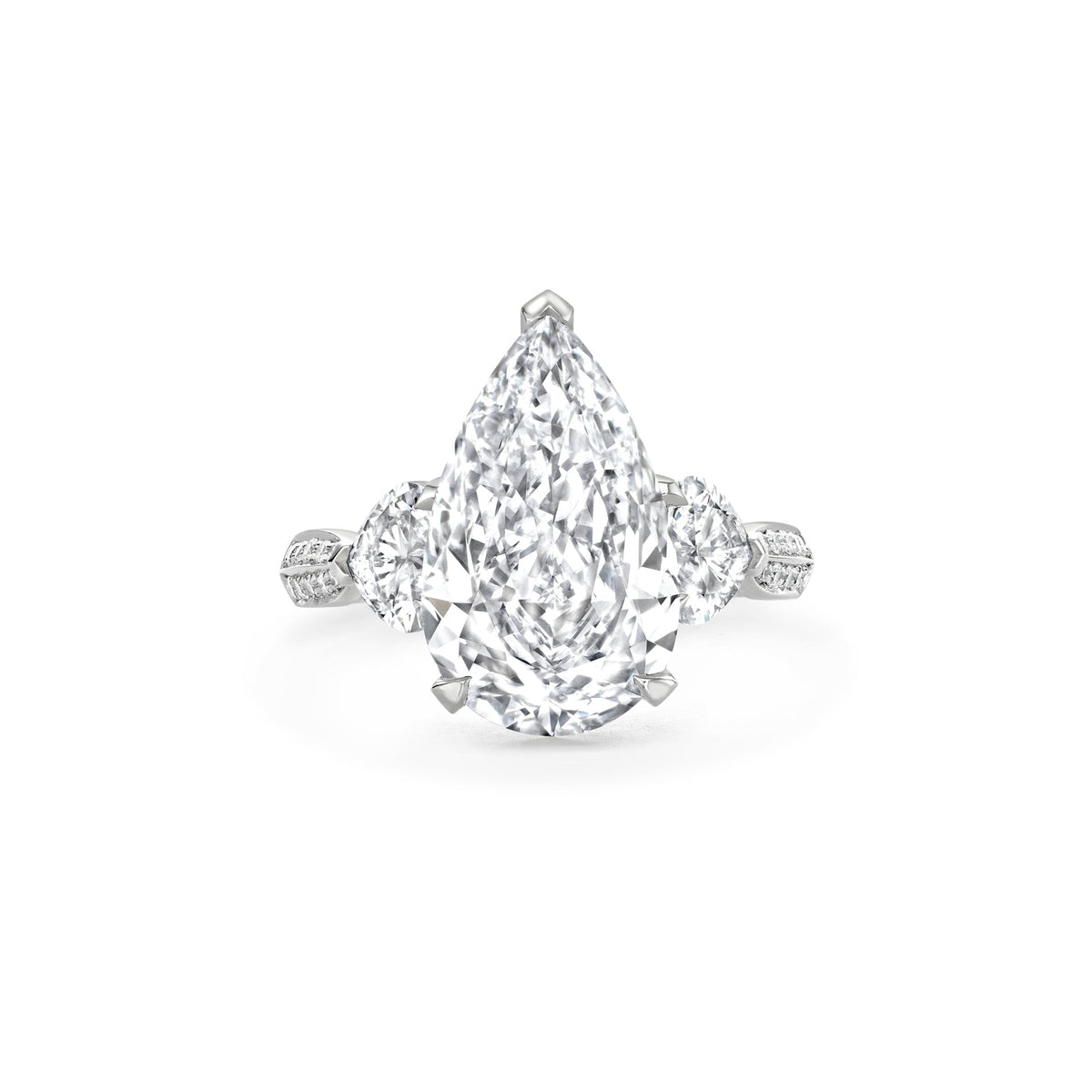 A Petal design ring set with a pear shape diamond and heart cut diamond shoulders in platinum. The main pear diamond is certificated 5.19 carats FVS2. The total weight of the 2 heart diamonds is 1.00 carats, and additional brilliant cut diamonds is 0.27 carats. By Boodles.