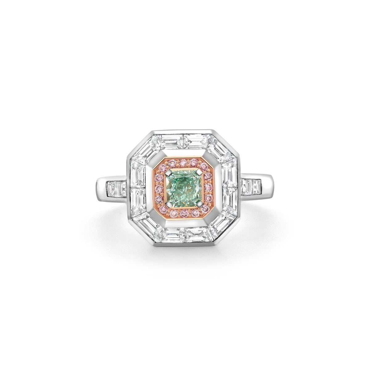 Vintage Radiant Cut Green Diamond and Pink Diamond Ring
