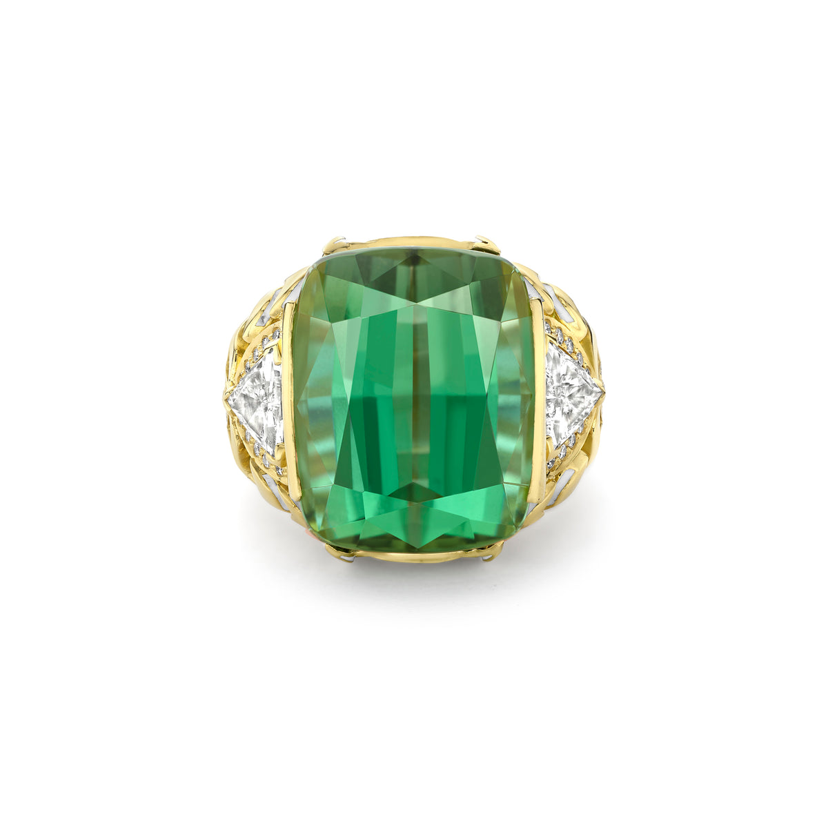 A Seville design ring set with a cushion shape green tourmaline, diamonds and blue enamel in 18 carat Single Mine Origin yellow gold. The weight of the main green tourmaline is 22.02 carats. The total weight of the 2 trilliant cut diamonds is 0.81 carats and additional brilliant cut white diamonds is 0.66 carats and yellow diamonds is 0.19 carats. Part of the Travel Collection. By Boodles.
