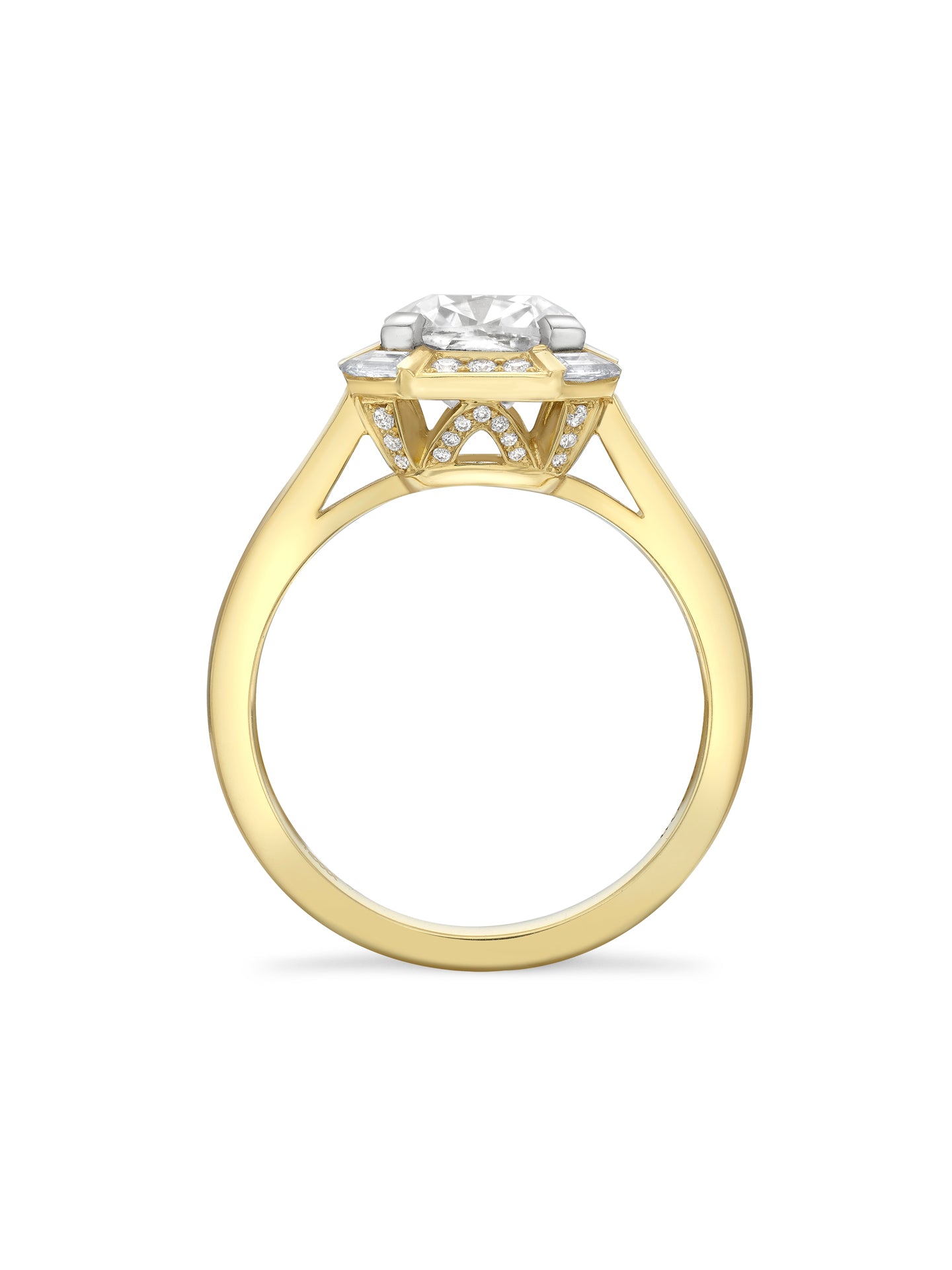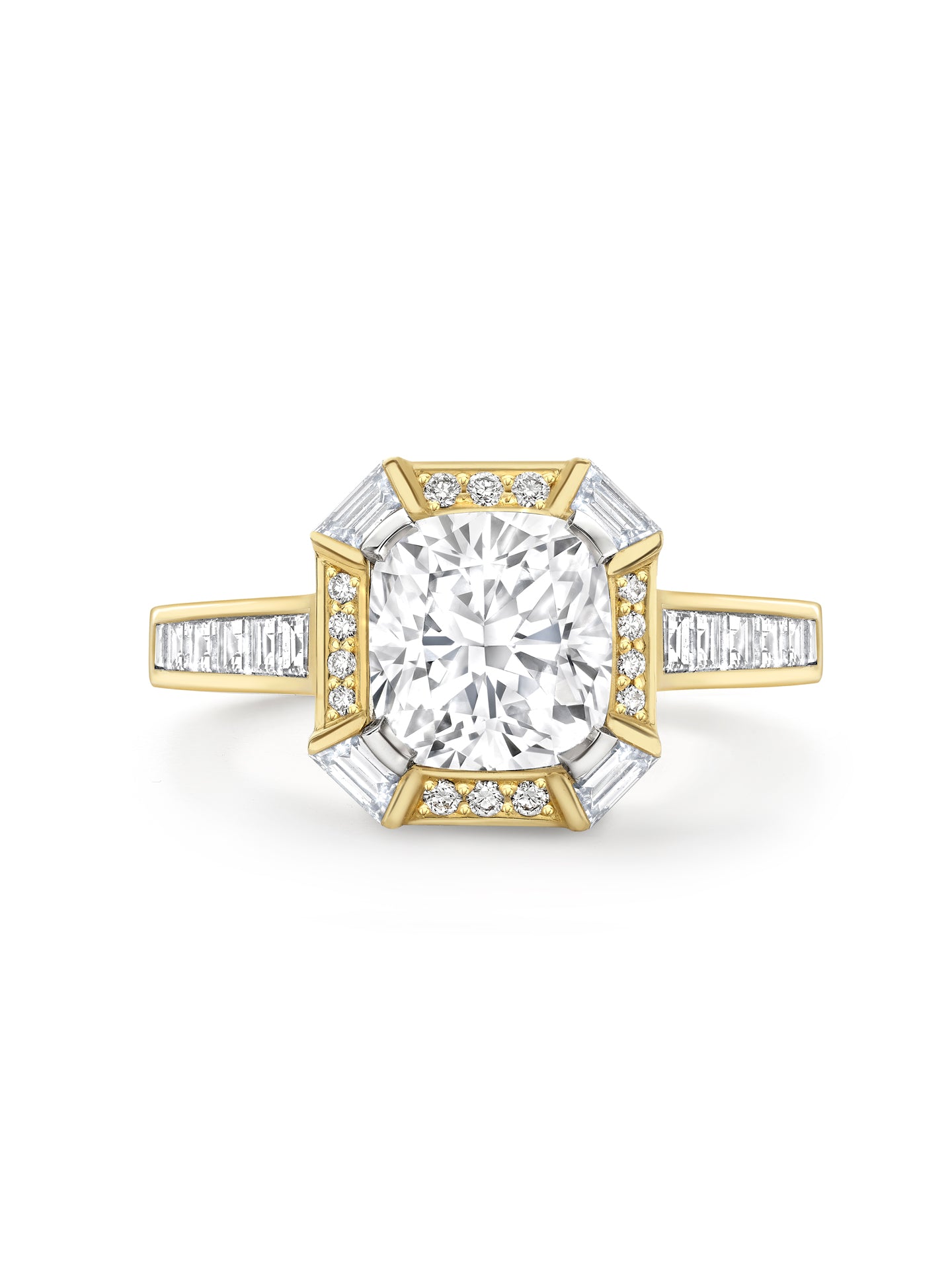 An Art Deco design ring set with a cushion cut diamond set with trapeze and brilliant cut diamonds set in 18 carat Single Mine Origin yellow gold. The weight of the main certificated cushion cut  diamond is 2.12 carats DVS1 Type lla Cullinan mine South Africa . The weight of the 16 additional trapeze and carré cut diamonds is 0.58 carats and 40 brilliants cut diamonds is 0.12 carats. By Boodles.