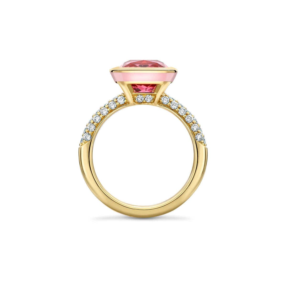 A Florentine design ring set with a cushion shape pink tourmaline and pink enamel in 18 carat Single Mine Origin French gold. The total weight of the pink tourmaline is 3.33 carats and brilliant cut diamonds is 0.44 carats. By Boodles.