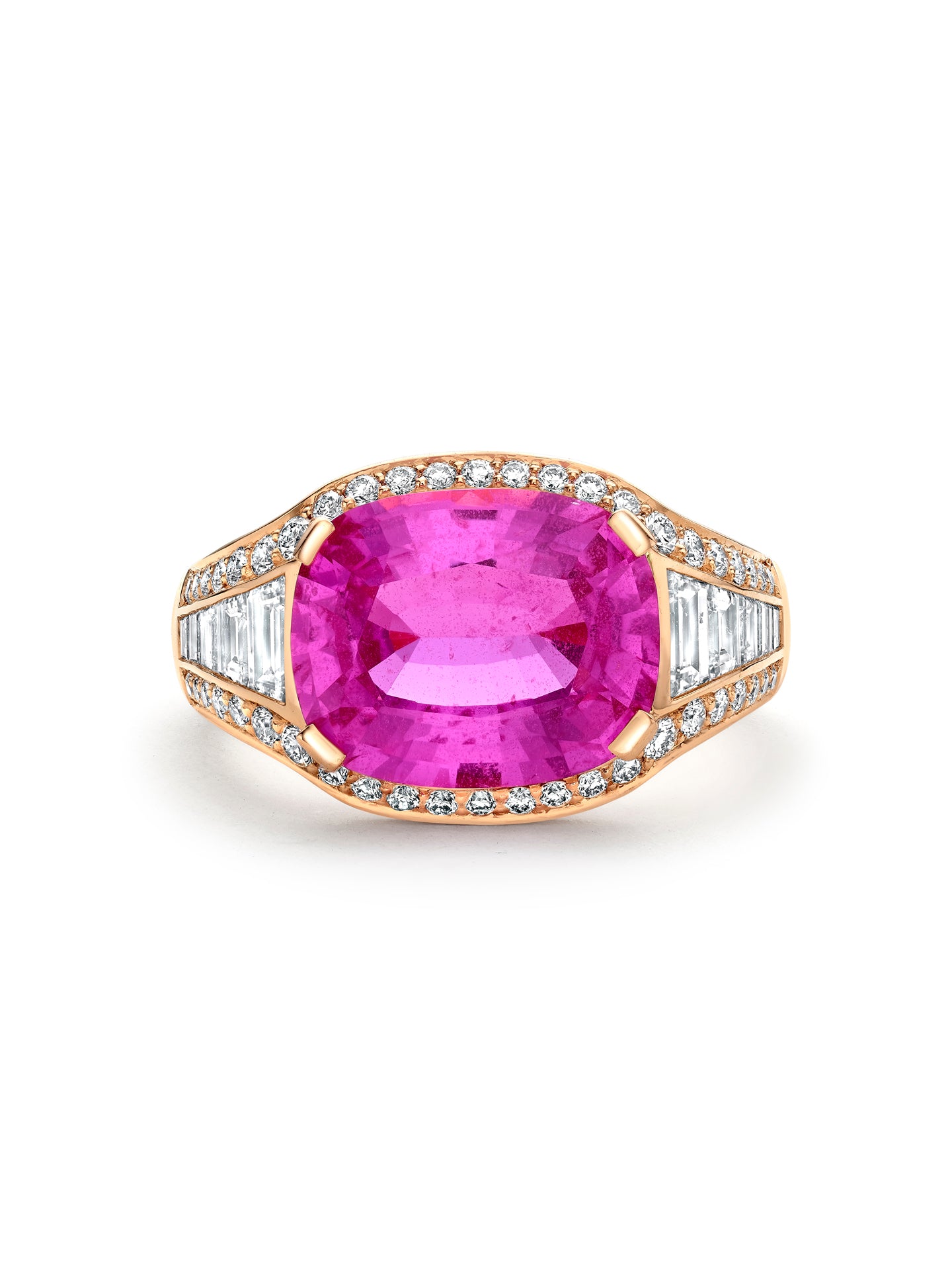 A cushion shape pink sapphire ring set with tapered baguette diamond set shoulders in a channel setting set in 18 carat Single Mine Origin rose gold. The main pink sapphire is certificated 5.02 carats Madagascar. The tapered baguette diamonds weigh 0.54 carats and the additional brilliant cut diamonds weigh 0.33 carats.