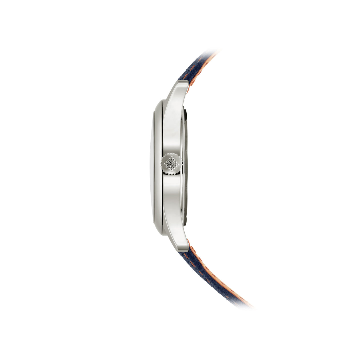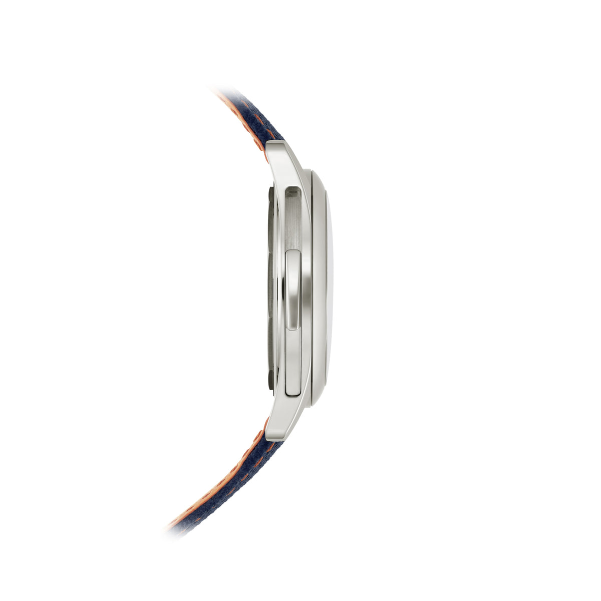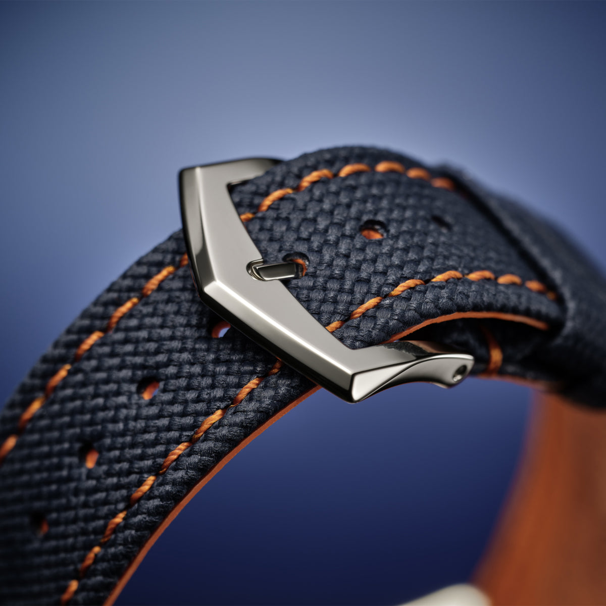 This exceptional timepiece combines the minute repeater with a modern design featuring a white gold case and a navy blue dial distinguished by a centrally embossed carbon pattern. This dynamic style is reinforced by the contrasting touch of color provided by the orange varnished small seconds hand, the orange transferred triangle hour-markers and the orange stitching and lining on the fabric-patterned navy blue composite strap.