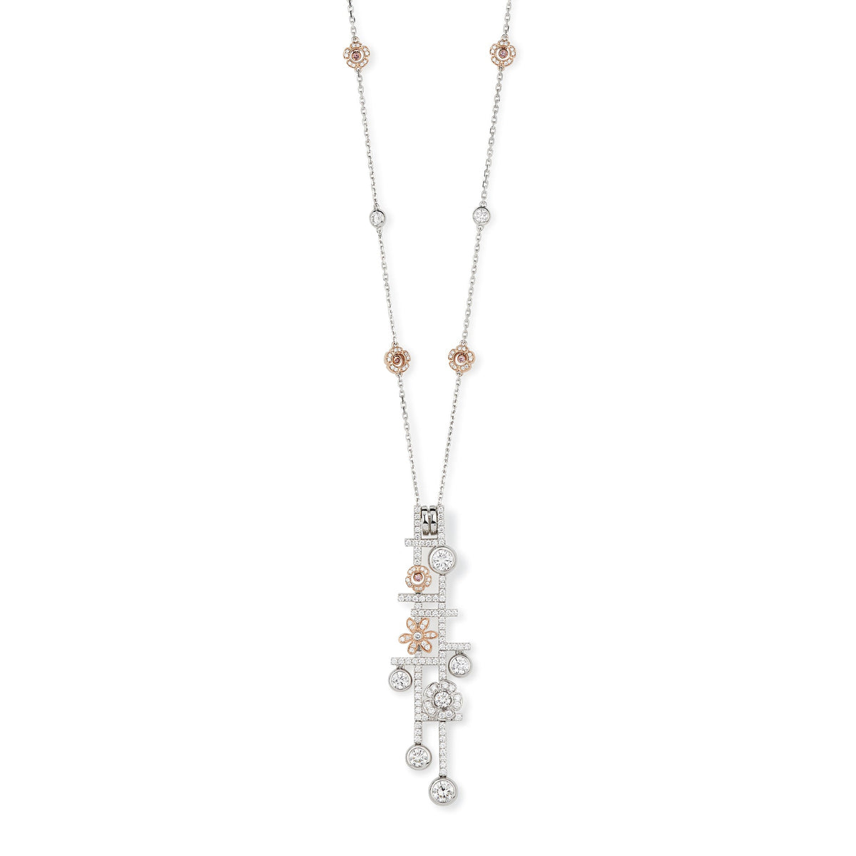 The Walled Garden suite from Boodles eagerly awaited Secret Garden collection. A blend of sparkling white round-brilliant cut diamonds are intertwined exquisitely with a dash of flourishing pink diamonds. Designed and created in house by Boodles ateliers, this feminine pendant is available in a platinum and 18 carat SMO rose gold setting. White diamond weight equals 3.42 carats approximately, pink diamond weight equals 0.06 carats approximately. The chain length is approximately 44cm.