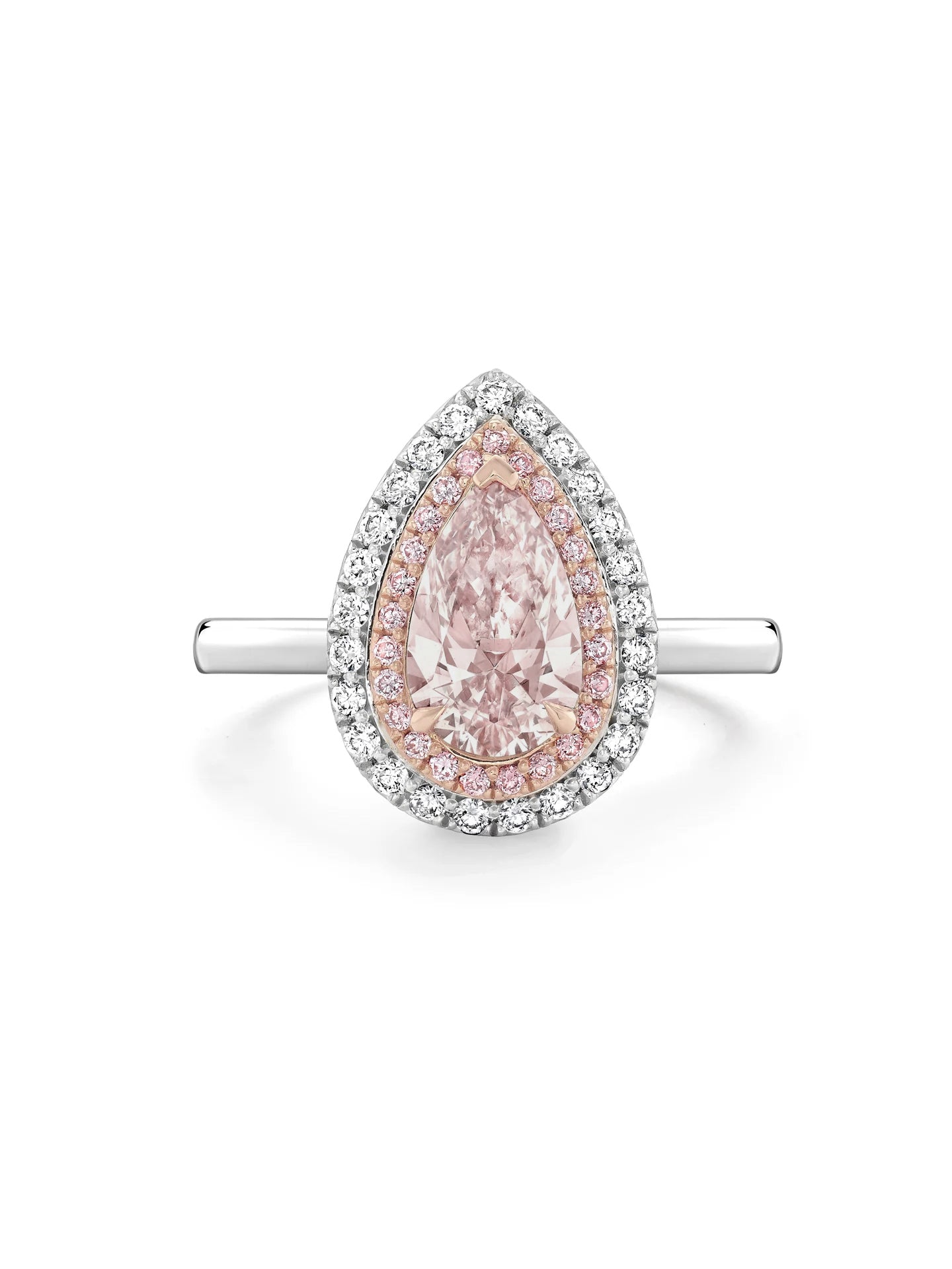 A Vintage design ring set with a pear shape pink diamond in platinum and 18 carat Single Mine Origin rose gold. The main pear diamond is certificated 1.00 carats Light pink - brown SI1. The total weight of the additional brilliant cut pink diamonds is 0.10 carats and white diamonds is 0.23 carats. By Boodles.
