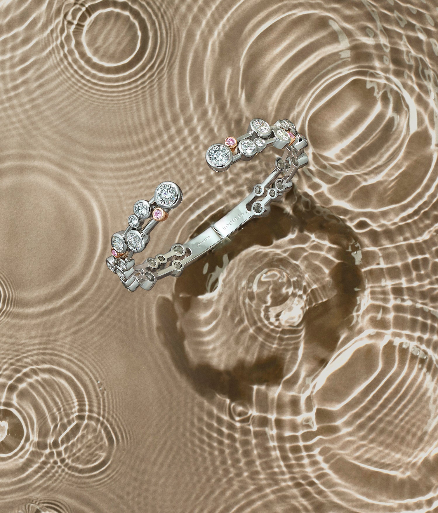To mark the anniversary of these pieces that are so synonymous with Boodles, Raindance 25 is an anniversary collection that adds a new twist to the classic designs: exceptional pieces featuring rare, beautiful pink diamonds from the Argyle Mine, set among the classic white diamonds that have come to define the original design. The Raindance design has always been about capturing a moment—the playful, scattered droplets you see on a quiet, rainy day. A quintessentially British scene, and a bit like Boodles itself… fun, unique, and British to the core.