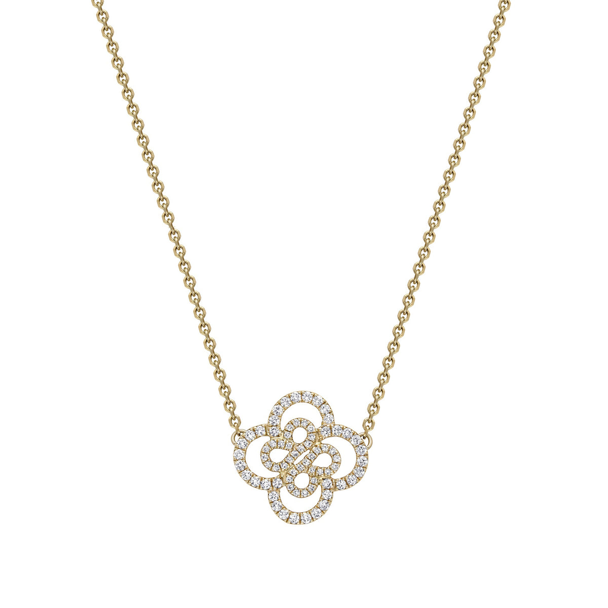 Mirrored pairs of diamond-set 'B' motifs feature in this elegant double motif diamond pendant, imitating the curving lines of antique lace. This pendant is set in 18ct yellow gold and the weight of the round brilliant diamonds is approximately 0.40 carats.