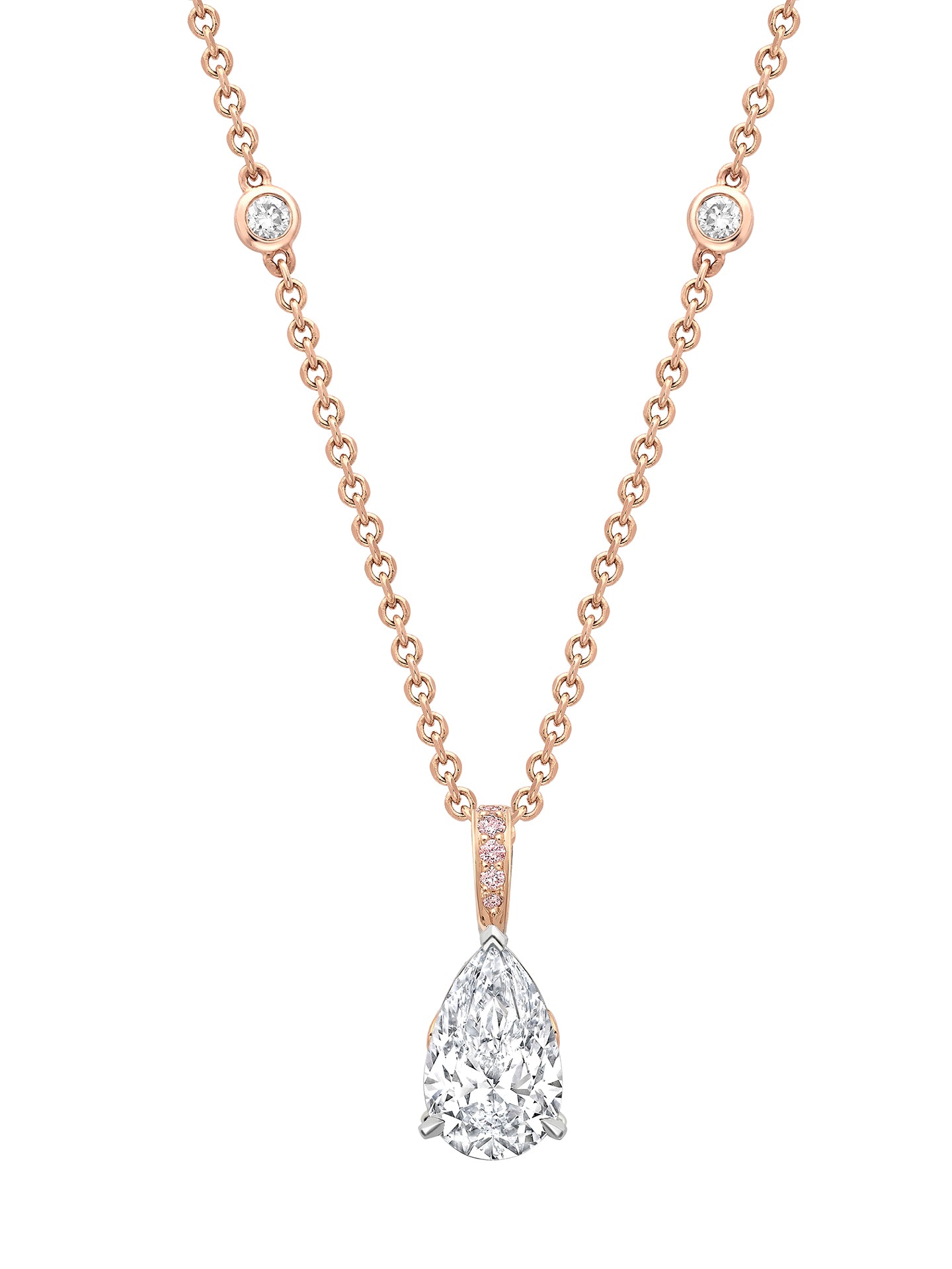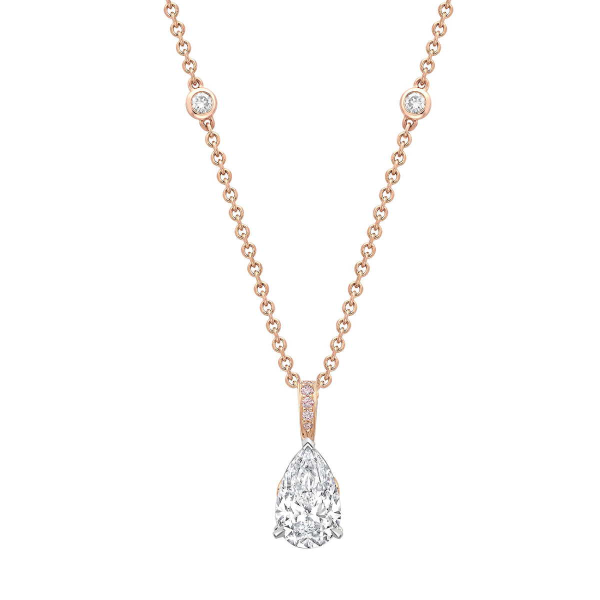 A classic single stone pendant set with a pear shape diamond in 18 carat Single Mine Origin rose gold and platinum. The main pear diamond is certificated 2.02 carats HVVS1. The total weight of the additional brilliant cut pink diamonds is 0.08 carats and white diamonds is 0.09 carats. By Boodles.