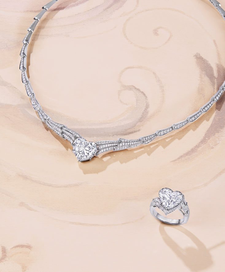 Angel-wing motifs from Florence’s frescoes inspired the design of this suite, in particular, those at Palazzo Vecchio. Symbols of innocence, purity and hope, their depictions by Vasari, Ghirlandaio and Bronzino are transformed in this necklace and ring. Heart-shaped diamonds are their heavenly stars, at 8 and 5 carats respectively.