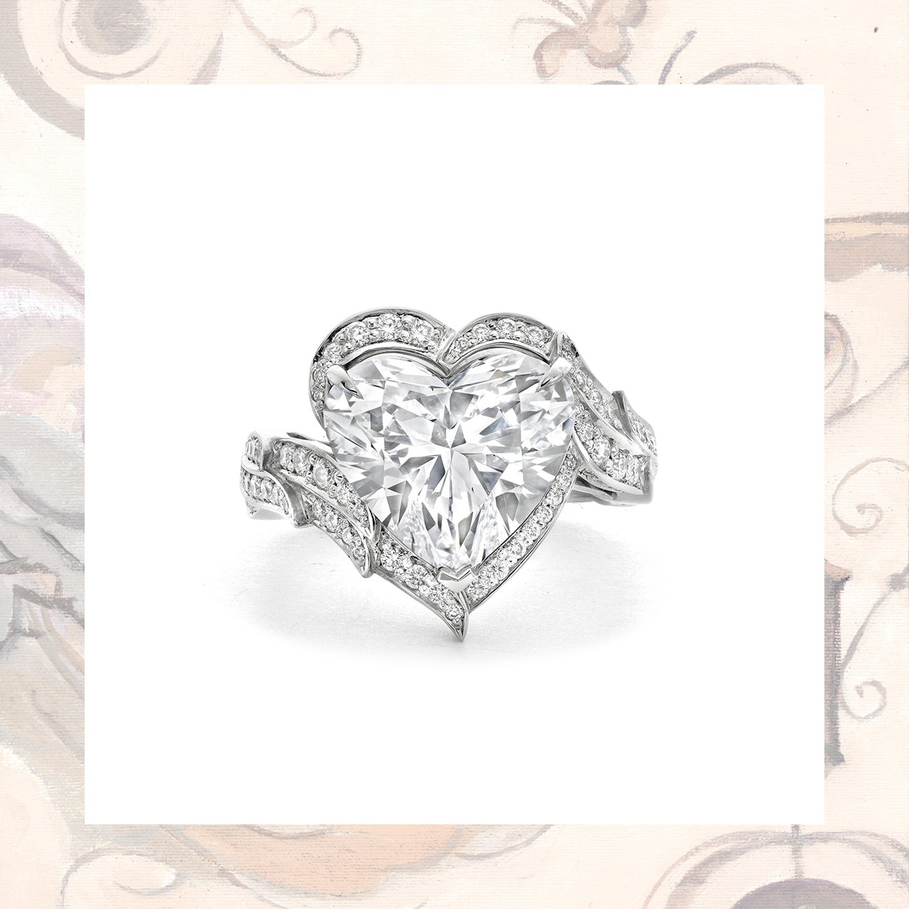 A Florence design ring set with a heart shape diamond in platinum. The main heart diamond is certificated 5.39 carats DIF. The total weight of the additional brilliant cut diamonds is 0.62 carats.