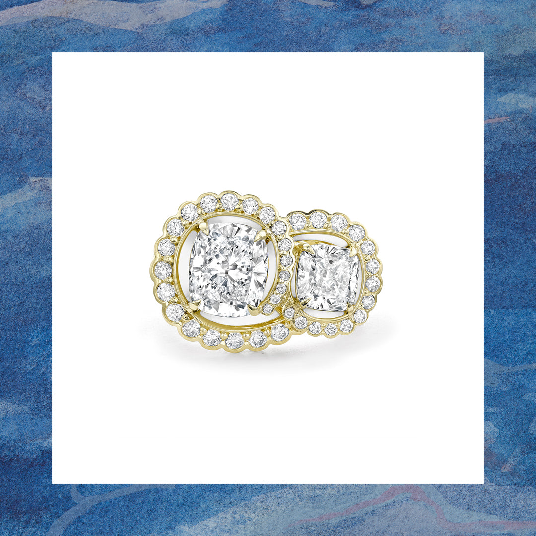 Speed around the racetracks of Monaco with this beautiful Gemini ring. Cushion-shaped diamonds each vie for victory: at 2.35 and 1.26 carats respectively.