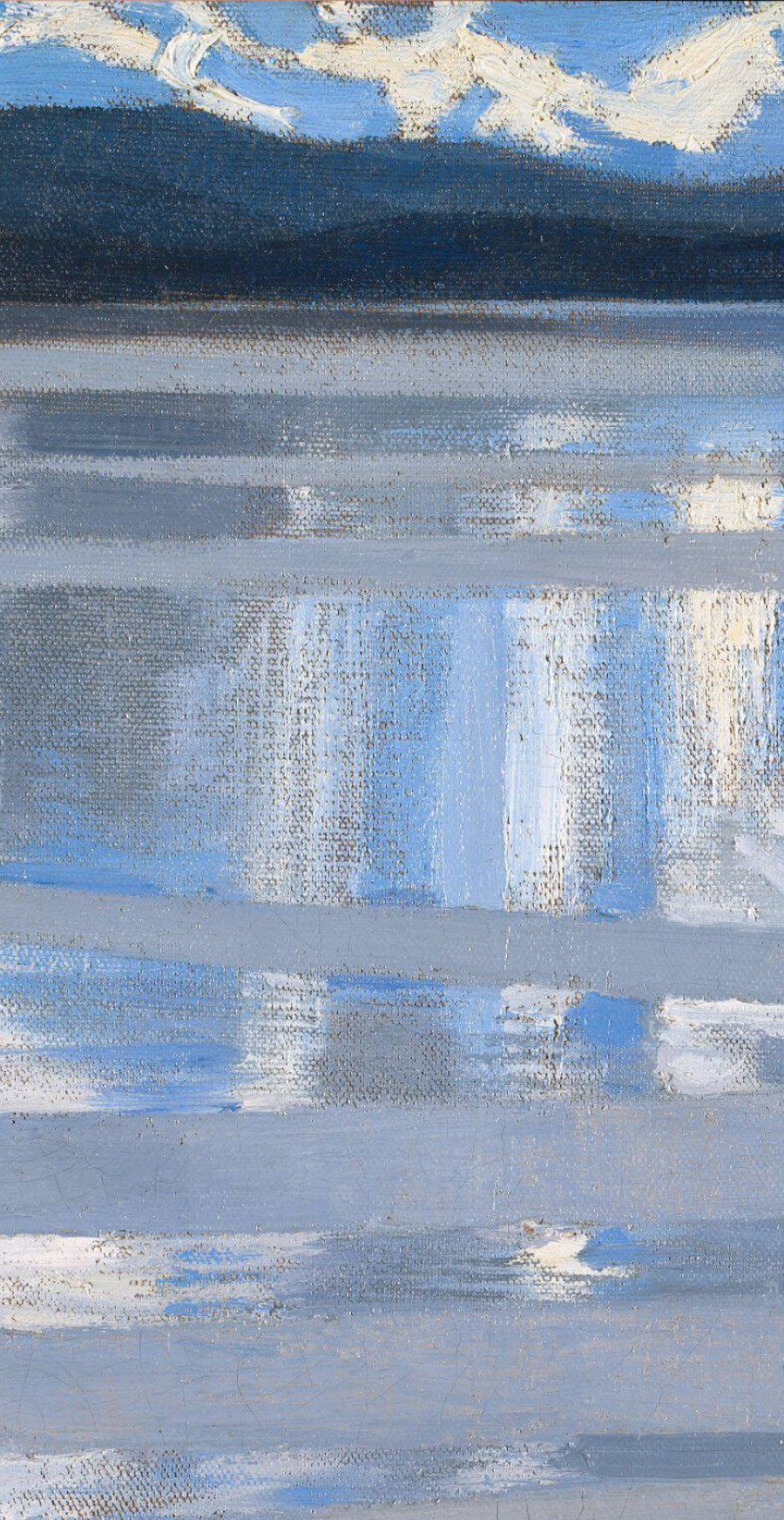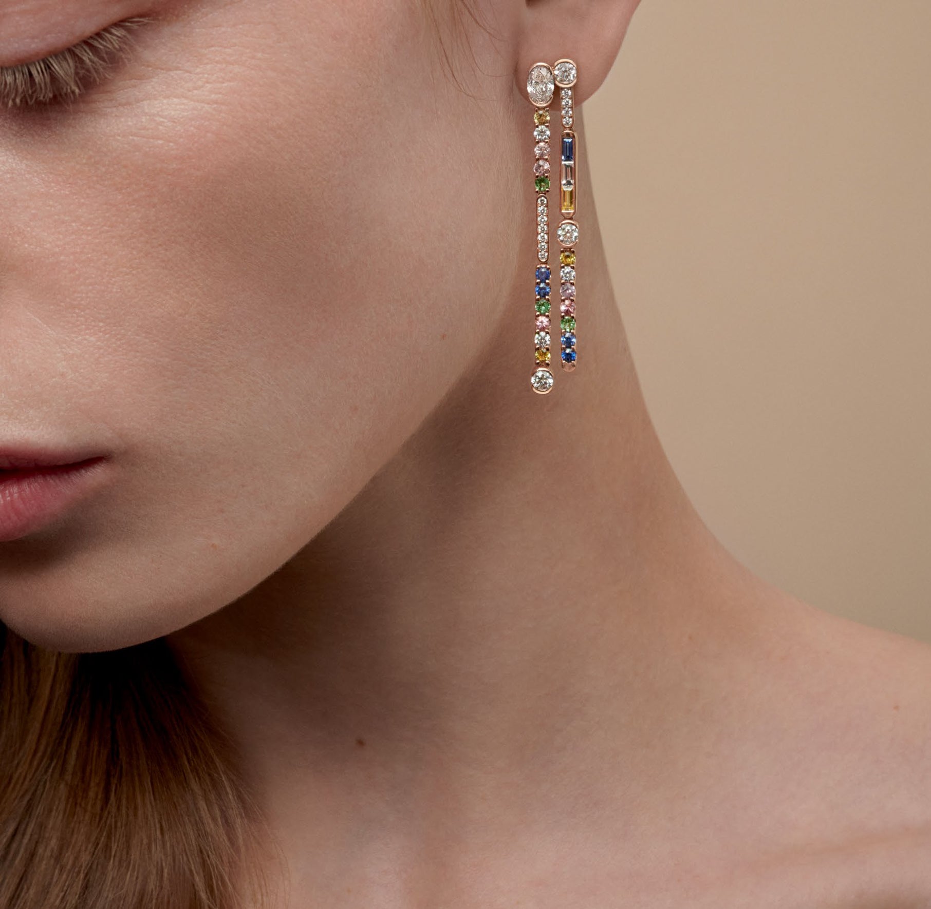 The suites in this collection take their inspiration from a number of different paintings, all of which are found at the National Gallery. The tones of Monet’s Water-Lilies, Setting Sun, about 1907, are reflected in our multi-gemstone collar and earrings, evoking an experimental approach to capturing the modulations of light as it transforms water. Boodles designers also responded to the distinctive zigzag pattern on the water’s surface in Lake Keitele, 1905 by Akseli Gallen-Kallela, now mirrored by rows of marquise cut diamonds. Bars of diamonds and sapphires reflect the bold dabs of colours found in Seurat’s The Morning Walk, 1885. Whereas Pierre-August Renoir’s Moulin Huet Bay, Guernsey, about 1883 –with its bright sea blues and lemony sparkles were the impetus behind the corresponding bangle, pendant, ring and earrings.