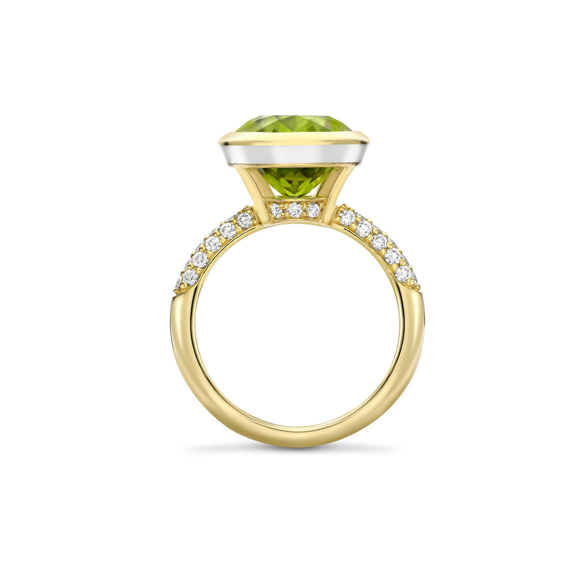 A Florentine design ring set with an oval shape peridot and white enamel in 18 carat Single Mine Origin French gold. The total weight of the peridot is 8.69 carats and brilliant cut diamonds is 0.39 carats. By Boodles.