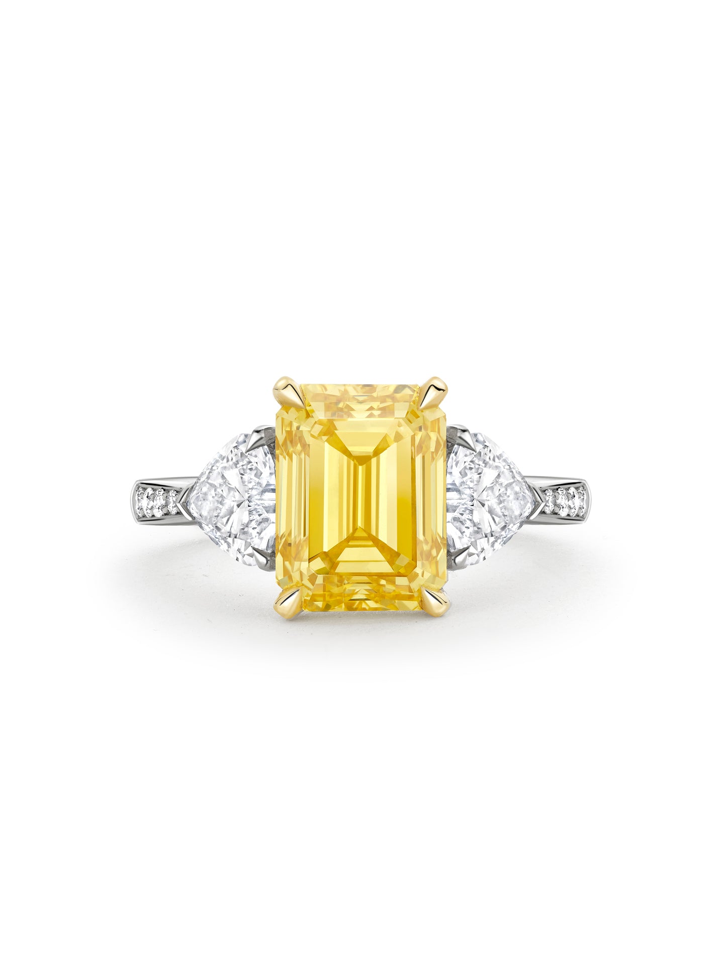 A Petal design ring set with an Emerald cut Yellow diamond and Heart shape diamond shoulders in platinum and 18 carat Single Mine Origin yellow gold. The main yellow diamond is certificated 3.82 carats Fancy Vivid Orangy Yellow. The weights of the 2 heart diamonds are 0.51 carats DVS1 and 0.50 carats EVS1. The additional brilliant cut yellow diamonds is 0.02 carats and white diamonds is 0.12 carats. By Boodles.