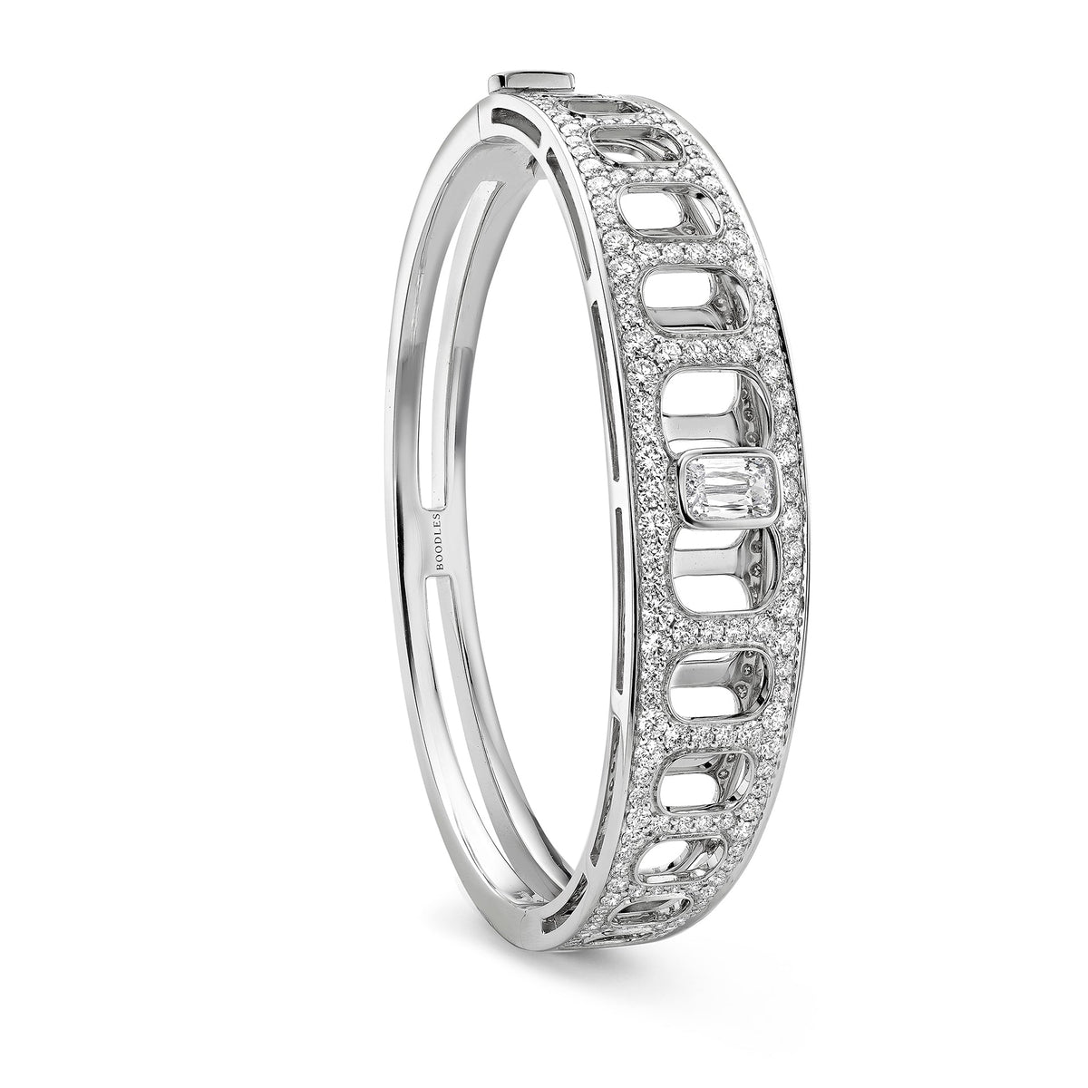 A Perspective design bangle set with an Ashoka cut diamond in platinum. The main Ashoka diamond is certificated 0.70 carats FVVS1. The total weight of the additional brilliant cut diamonds is 3.12 carats. Part of the National Gallery Collection. By Boodles.