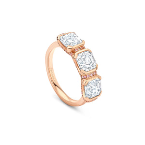 A 3 stone Asscher diamond ring in 18 carat Single Mine Origin rose gold. The total weight of the Asscher diamonds is 3.02 carats and additional pink diamonds is 0.21 carats. By Boodles.